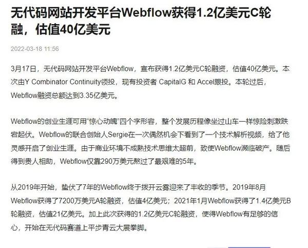 前几天,webflow 融资 1.2亿美元,估值40亿美元。