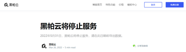 3月21日,黑帕云发布公告,将于5月31日停止服务!曾经上过艾瑞咨询、风光无限的黑帕云,停止服务了!