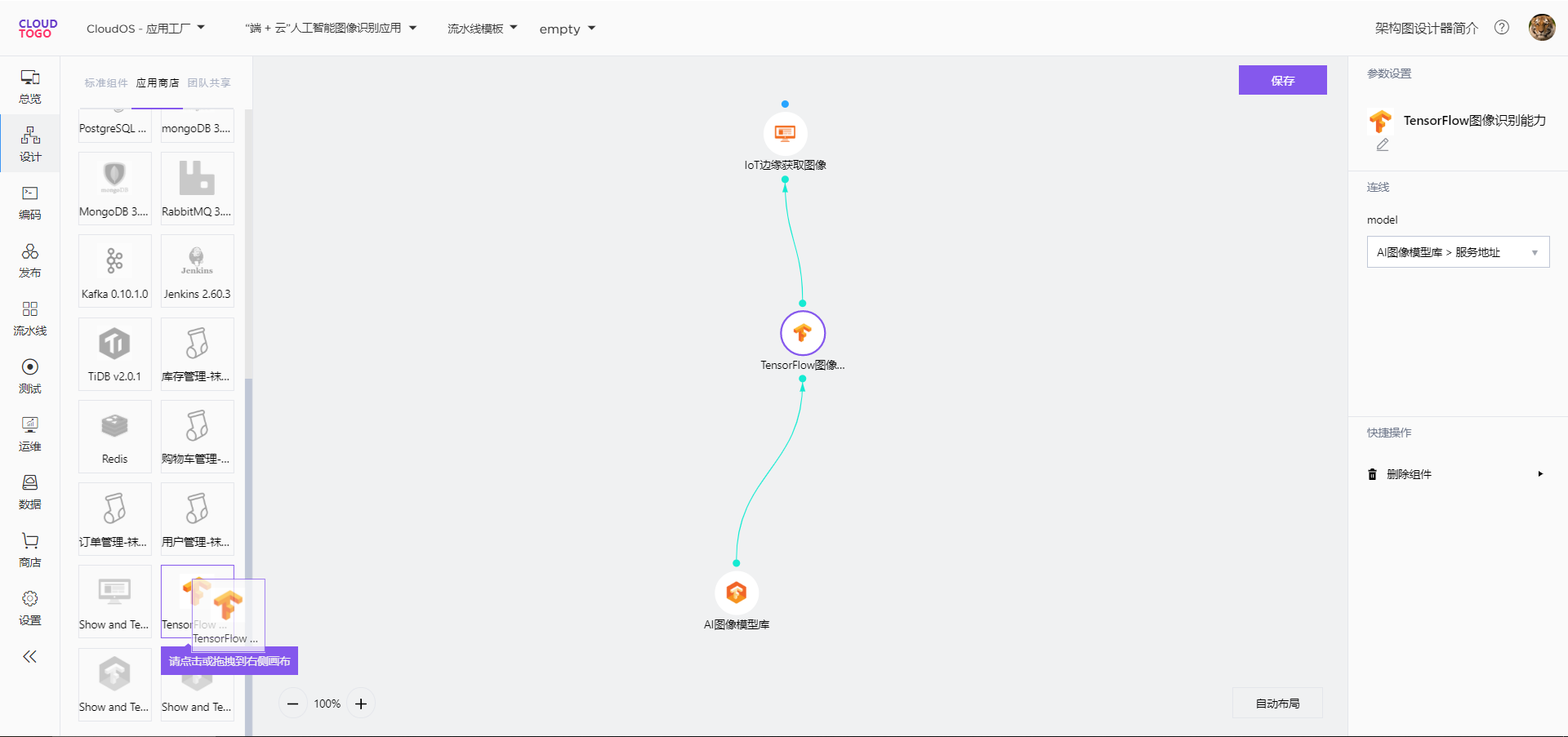 借鉴工业领域模块化组装的概念,以图形化通过拖拉拽边缘模块、云侧模块的能力,快速构建物联网业务。 设计好的架构图以自研蓝图规范格式存储,可以一键式交付到任意端侧和云侧环境。用来组装应用的模块来自于企业内部或是社区内开发者贡献于应用商店的内容,开发者随时可以设计、分享新的模块。
