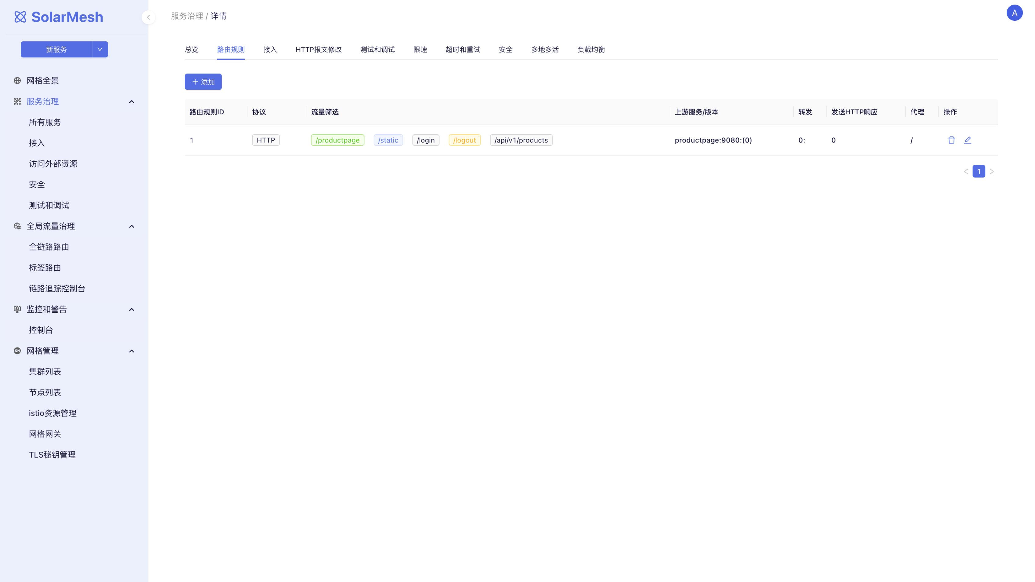 导入SolarMesh的所有服务都会出现在“服务治理>所有服务”中,用户可以在这里做精细的设置。这些设置被划分为: