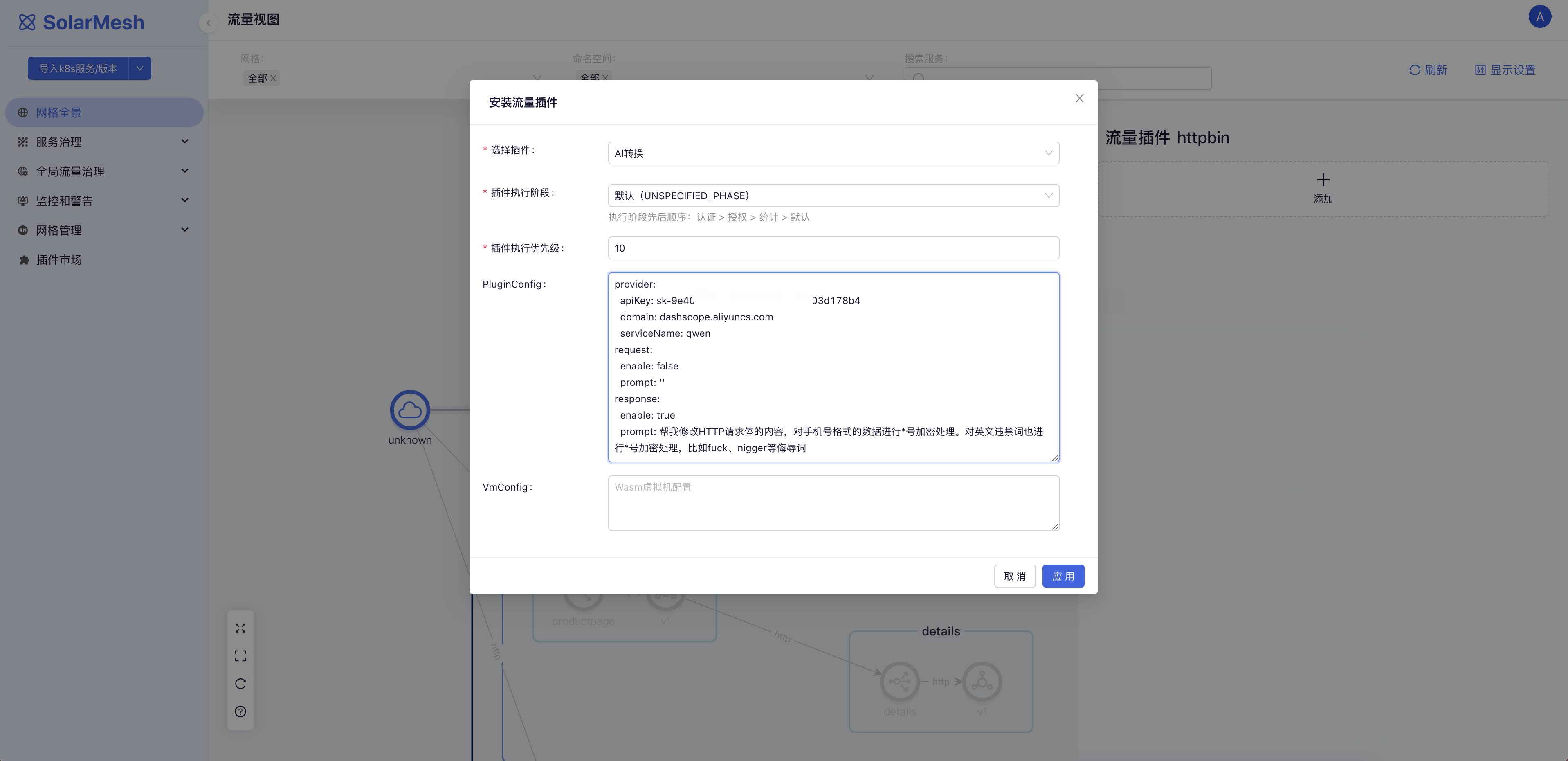 如何应用插件呢?我们在流量视图中选择测试服务 httpbin,并为其选择流量插件:AI-Tranformer。我们设置一个Tranformer规则,假设接口的返回内容中有手机号格式的数据或者有侮辱性的词汇,那么直接用*号将其覆盖。